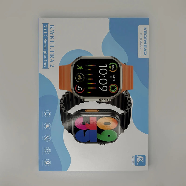 ساعت هوشمند مدل KW 8 ULTRA 2 یک ساعت هوشمند و مدرن است که به شما امکان میدهد با تمام ویژگیهای جذابش به راحتی در محل کار، ورزش و حتی مواقع رسمی، خوش تیپ و شیک باشید.این ساعت هوشمند دارای قابلیتهای فراوانی است. با قابلیت مکالمه (از طریق اتصال به بلوتوث) و پخش موسیقی، شما میتوانید از تماس با دوستان و موسیقیهای مورد علاقهتان لذت ببرید. اما قابلیت برجستهتر این ساعت هوشمند، سنسورهای سلامتی فراوانی است که دارد. با پایش ضربان قلب، فشار خون، اکسیژن خون و…، این ساعت به شما کمک میکند تا سلامتی خود را بررسی کرده.ساعت هوشمند مدل KW 8 ULTRA 2 با داشتن شش بند اضافی با رنگهای مختلف،امکان انطباق با سلیقه و نیازهای مختلف کاربران را فراهم میکند.