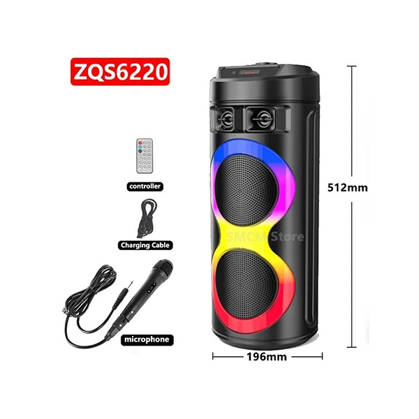 اسپیکر بلوتوثی مدل ZQS-6220 از جدیدترین مدل های سری ZQS به شمار می رود. این اسپیکر با داشتن درایور 13 اینچی، از قدرت پرتاب صدای بهرهمند است و در محیطهای باز و بسته عملکرد قابل قبولی را به مخاطب ارائه میدهد. این اسپیکر بلوتوثی ساختار مقاوم و مستحکمی دارد. این ساختار دارای یک روکش با کیفیت است که مقاومت بالایی در برابر خط و خش و ضربه دارد. بنابراین میتوانید با خیالی آسوده ZQS-6220را همراه خود به سفر و طبیعت ببرید. اما این اسپیکر تنها پخش کنندهی صدا نیست و با داشتن رقص نور جذاب و متغیر میتواند جلوهی زیبایی به مهمانیهای شما ببخشد. افزون بر همهی موارد گفته شد، همراه بودن ریموت کنترل و میکروفون، این اسپیکر بلوتوثی را به یک پخش کنندهی صوتی قدرتمند و حرفهای مبدل ساخته است.